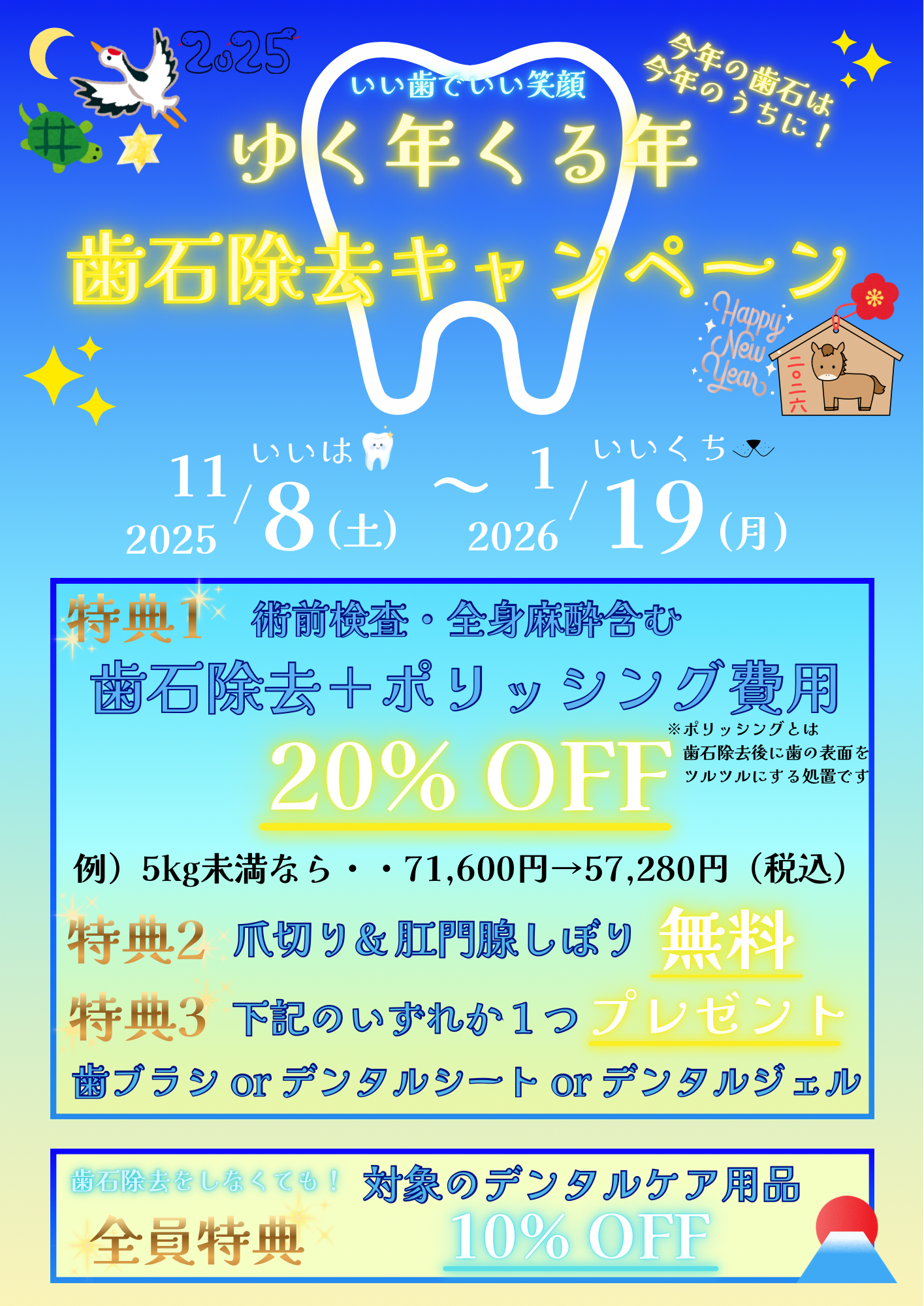 2025年11月8日~2026年1月19日まで歯石除去キャンペーンを実施中です! 期間中は歯石除去の費用が20%OFFになるほか、対象のデンタルケア製品が10%OFFでお買い求めいただけるなど、 盛りだくさんの内容となっております。 ぜひこの機会をお見逃しなく。 歯石を除去してきれいなお口で新年を迎えましょう! 詳細は当院ホームページ「お知らせ」をご覧ください。 https://www.beluga-ah.jp/ ご予約はこちらから Tel 04-7199-7344