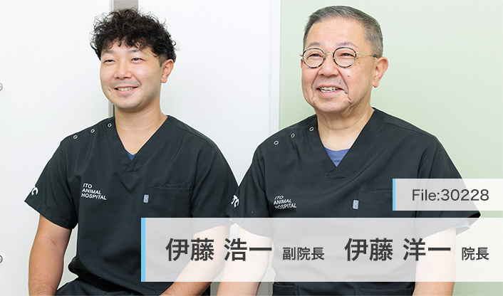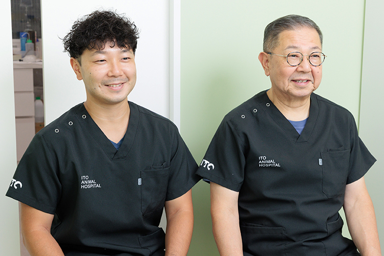 3つのグループ院とともに地域に根差し「どんな時でもそばに寄り添う、ヒトとペットに優しい病院」を理念に掲げる「伊藤動物病院」。開業以来変わらないアットホームな雰囲気を大切にしつつ、精密な検査や低侵襲な外科手術などを提供し、犬と猫を中心に1.5次診療の役割も果たしている。温かな人柄の伊藤洋一院長をはじめ、外科、循環器、皮膚疾患など、それぞれに得意分野を持つ複数人の獣医師が在籍。伊藤浩一副院長は、父である洋一院長の背中を見て獣医師をめざし、東京大学附属動物医療センターや麻布大学などで二次診療や研究に携わった後に同院の診療に加わった。いずれは同院を率いることも視野に入れ、今も研鑽を積み重ねている。大きなガラス窓から明るい光が差し込む院内で、両先生に話を聞いた。(取材日2025年9月25日)