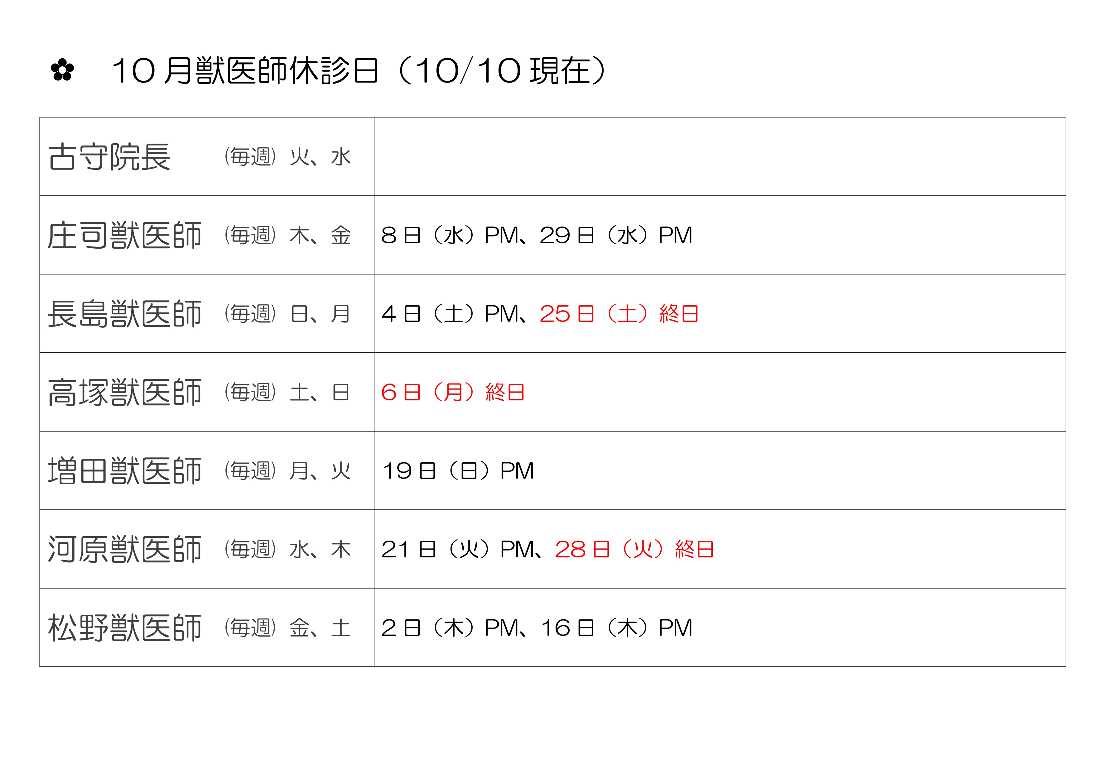 お知らせです ◯10月、11月の獣医師のシフトについて 再診の方は、添付表にてご確認のうえご来院してください。